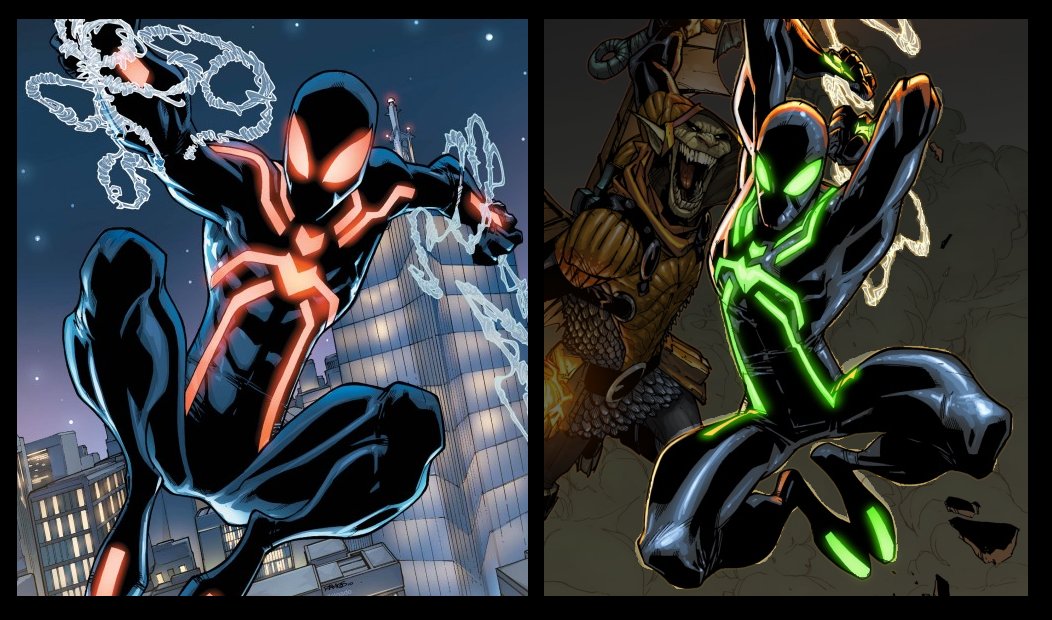 Ma se l’italianissima Sara Pichelli mi tira fuori un costume del genere, non posso non metterlo in classifica! Miles Morales è un giovane afro-americano che dopo la morte di Peter prende il suo posto, morso egli stesso da un ragno OGM, e diventa il nuovo Ultimate Spider-Man. Ha i soliti poteri, anche se il senso di ragno gli lascia un margine di reazione notevolmente ridotto. Come il 2099, può rilasciare un “tocco avvelenato” dagli effetti ancora abbastanza misteriosi. Può mimetizzarsi in stile Kaine ed ha ricevuto direttamente da Zia May i lanciaragnatele del nipote, potendo così lanciarsi dai grattacieli come tutti gli “Uomini Ragno normali”, insomma.