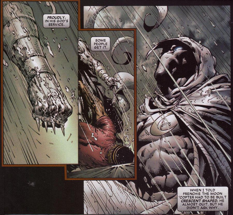 Ma una serie di eventi, su tutti l’aggressione subita dall’ amico Jean-Paul alias Frenchie, lo riporteranno sulla giusta carreggiata: quella della vendetta sanguinaria. Moon knight è, infatti, un comic oscuro e violento dove si sprecano ferite lacerocontuse, morti, sbudellamenti e persino scalpi. E i disegni di David Finch, che elogiavo già qualche riga più su, sono perfettamente in sintonia con questo tipo di atmosfera.