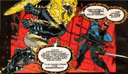 Ad ogni modo, dopo esserne venuto in possesso di una pagina del Darkhold, Blade evoca un’entità demoniaca dalle sembianze di sua madre. La creatura oscura gli conferisce un potere inimmaginabile che permette al cacciatore, una volta ingaggiata la lotta, di tenere testa contemporaneamente a John Blaze (ex Ghost Rider), Hannibal King e Frank Drake; e persino di sconfiggerli, uccidendo tutti tranne Drake. Blade, si accorge, inoltre, di avere ottenuto la capacità di fagocitare i poteri altrui e di ripeterne le abilità; un’attitudine, questa, che potrebbe risultare decisiva nella sua personale guerra contro tutto ciò che è sovrannaturale. E’ il momento perfetto per l’entrata in scena di Danny Ketch che, una volta appreso della morte di Blaze, si trasforma nello Spirito della Vendetta e parte alla ricerca del Cacciatore di Vampiri.